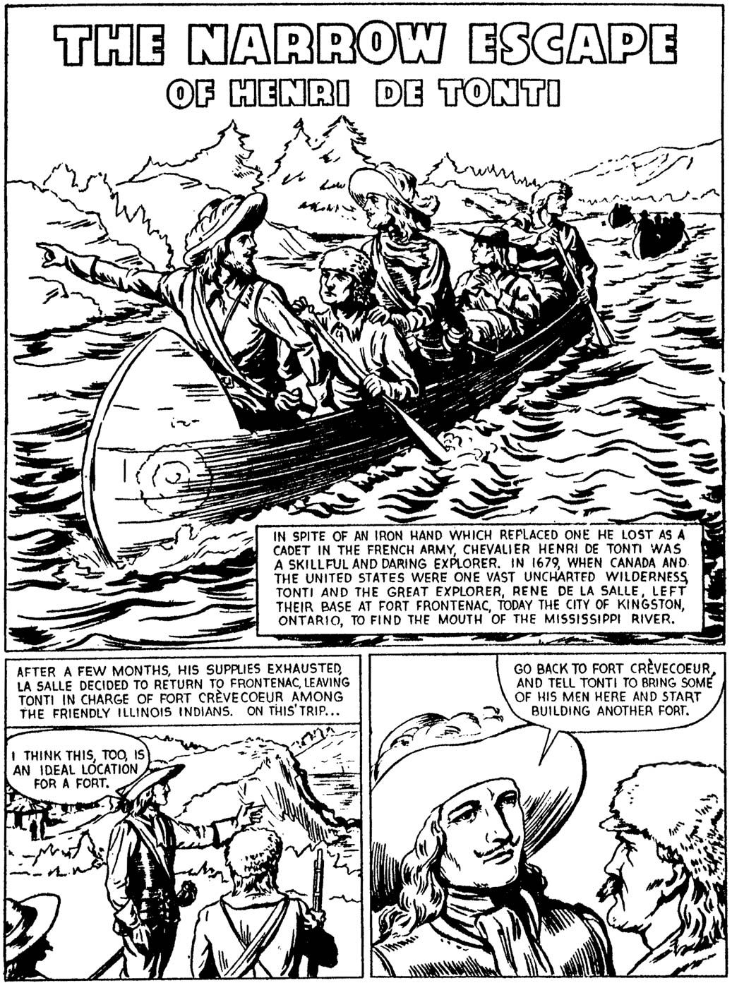 SCHAARE, C. R.Non-fiction: The Narrow Escape of Henri de Tonti (pen/ink/) in TRUE COMICS #26 (c) 1943 Parents Institute